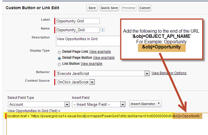 For Content Source use OnClick Javascript In the content box, add the following: location.href = "[GRID LINK YOU COPIED]&obj=OBJECT_API_NAME"; (See example below)